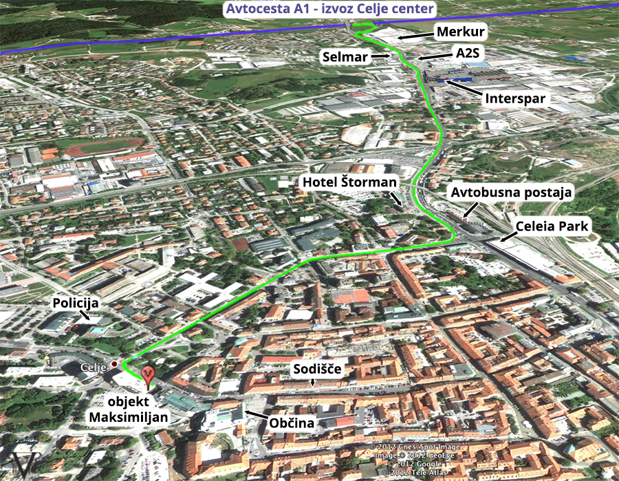Dostop z avtoceste je enostaven – peljemo se do izvoza avtoceste za smer Celje Center, nato po Mariborski cesti proti centru cca 2,5 km (mimo objektov Selmar, A2S, Planet Tuš, Interspar, skozi podvoz) do Hotela Štorman. V velikem semaforiziranem križišču pred Celeia parkom (ob avtobusni postaji) zavijemo desno in se peljemo cca. 500 m naravnost. Objekt “Maksimiljan” bo na Vaši levi.